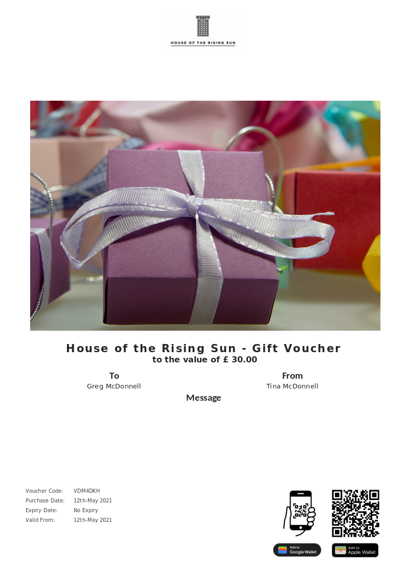 House of the Rising Sun allows you to purchase instantly printable gift vouchers, special offers and tickets using the Voucher Connect platform.